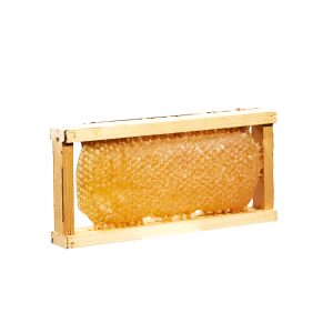 Ungeschnitten mit seinem Holzrahmen, Pure, Raw und Raw, so wie wir es aus dem Bienenstock genommen haben, behält es alle seine Inhaltsstoffe unverändert bei. Es hat einen hohen Nährwert aufgrund seines hohen Gehalts an Wachs, Propolis, Spurenelementen, Polyphenolen und Flavonoiden.